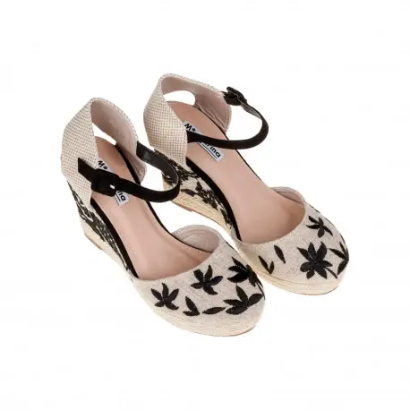 Alpargata con plataforma y cuña cubierta de encaje. Diseño único y elegante en color beis y negro. Cómoda a pesar de la altura.