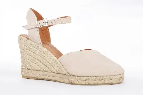 Exterior e interior en piel. Cuña de esparto natural reforzado con goma inyectada.