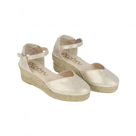 Confeccionadas con materiales textiles de alta calidad, estas cuñas doradas sutilmente brillantes cuentan con una plataforma de esparto de 2 cm y un tacón total de 5.5 cm.