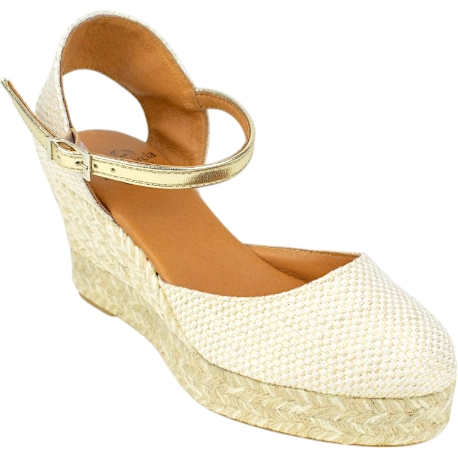 Cómodas y femeninas, las cuñas de esparto de Carmen García son un básico del Verano. El modelo 298JB está fabricado con tejido Casa Blanca, con bello punto en color platino.