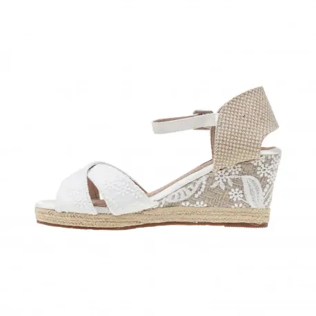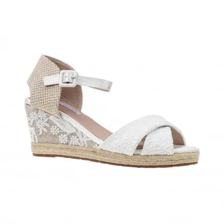 Sandalia de tiras cruzadas con cuña de esparto cubierto por un delicado encaje. Se sujeta al pie por una correa que rodea el tobillo. Color Blanco.