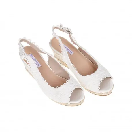 Sandalias de esparto con plataforma y cuña con encaje, muy femeninas y perfectas para combinar. Con este modelo premia la comodidad y la elegancia. Color blanco con precioso bordado floral. Cierre de hebilla y punta Peep Toe.
