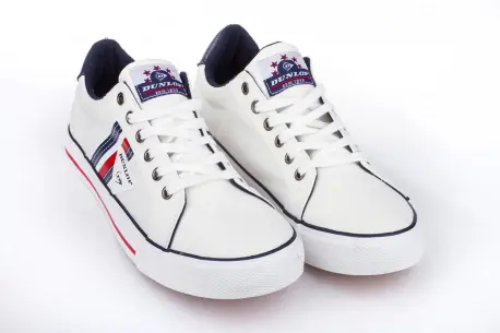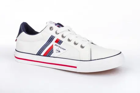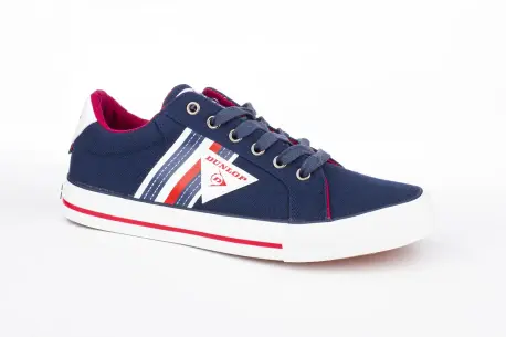 Zapatillas casuales fabricadas en lona de corte bajo para hombre. Tacón plano de 2.5 centímetros de goma con línea roja. Colores mezclados en blanco, azul marino y granate con diseño de triángulo con el logo de la marca en el lateral y el talón con pequeña bandera inglesa.