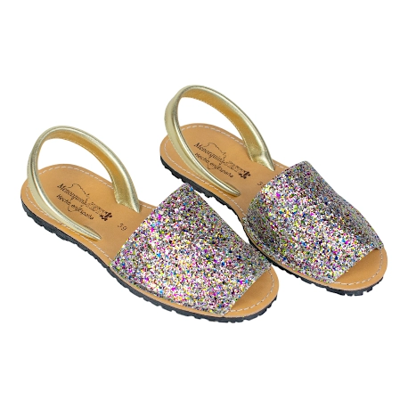 Eleva tu estilo con nuestras auténticas menorquinas, hechas en España con una suela de goma plana que combina confort y resistencia. Su exclusivo acabado de glitter multicolor añade un toque vibrante y chispeante a cualquier conjunto, mientras que la elegante tira dorada aporta un toque de sofisticación.