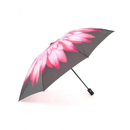 Presentamos el paraguas plegable inverso de Soake, con diseño de Margarita Rosa y funda negra. Este paraguas único se abre al revés, evitando que la superficie debajo se moje cuando está húmedo.