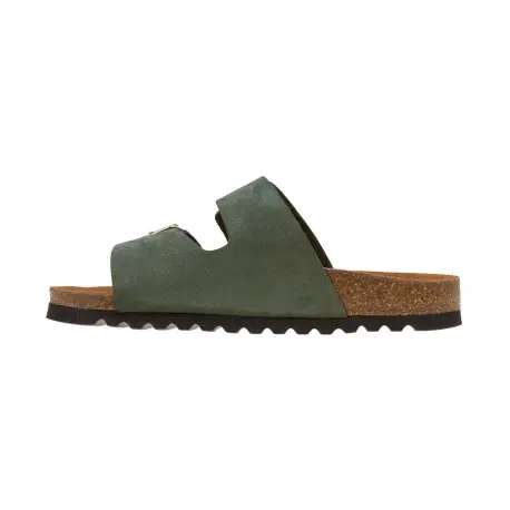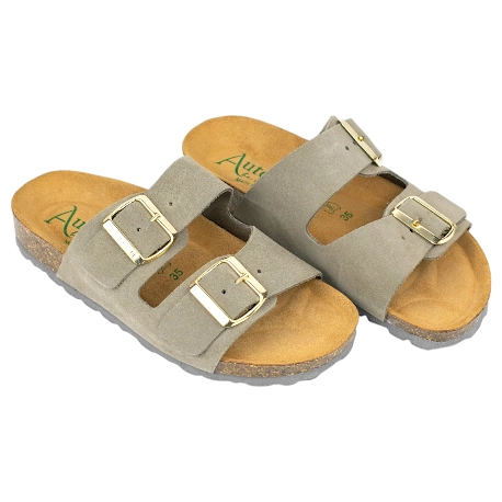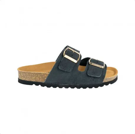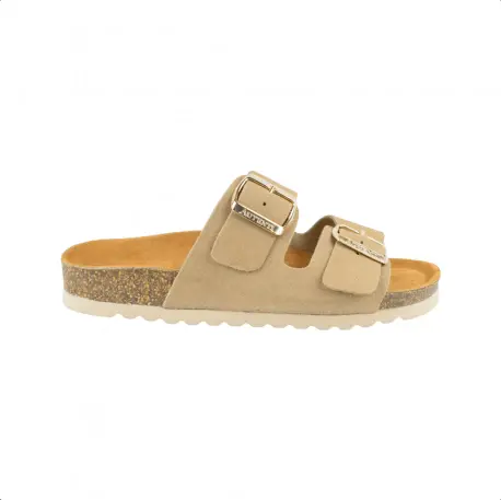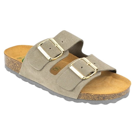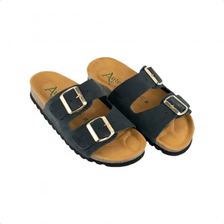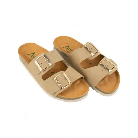 Sandalia bio, fabricada en seraje (piel) natural color negro, beige, marrón y verde. Plantilla que incorpora sistema de acolchado carbónico siempre respetando su diseño anatómico. Planta de corcho 100% natural. Diseño con doble cierre de hebillas ajustables para que se adapten mejor al ancho del pie. Calza normal.