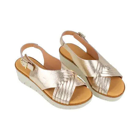Sandalias fabricadas en piel, con tacón de cuña y plataforma. Cuenta con plantilla de piel efecto gel, muy cómoda y acolchada. Calza normal.