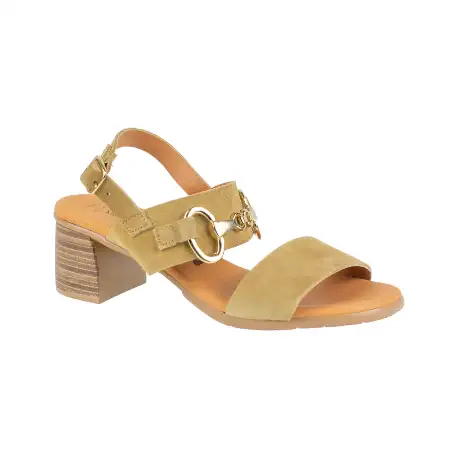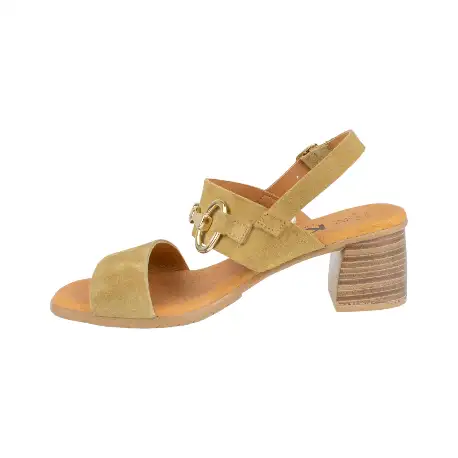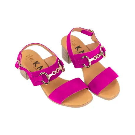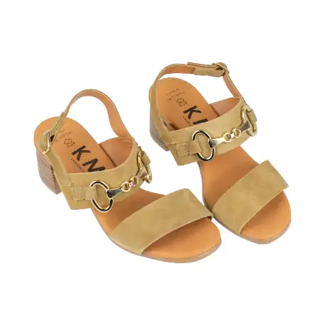 Sandalia de serraje de la marca KMN, modelo F-7001, diseñada con doble tira y estribo dorado para un toque elegante.
