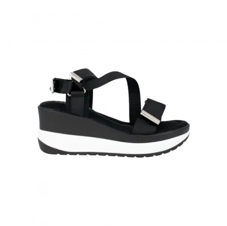 Sandalias casuales de tiras finas, fabricadas en tela color negro y multicolor con logo en el talón.
