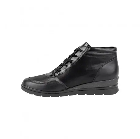 Este elegante botín negro cuenta con una cuña de 4 cm para un toque de altura sin sacrificar la comodidad.