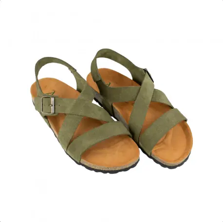 Sandalia bio de tiras cruzadas fabricado enteramente en piel natural color marrón y verde utilizando medios artesanales. Plantilla anatómica con acolchado carbónico que nos aporta comodidad duradera y un correcto descanso.