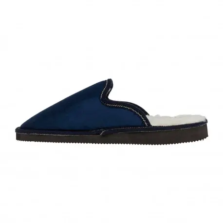 Zapatillas clásicas para hombre, diseño liso, fabricadas en tela, color azul marino. Tacón bajo y suela de goma, fabricado en España. Plantilla y forro de lana. Temporada otoño-invierno. Ideal baño y climas frios.