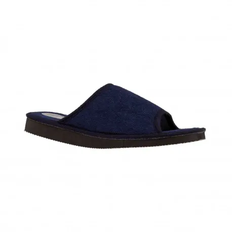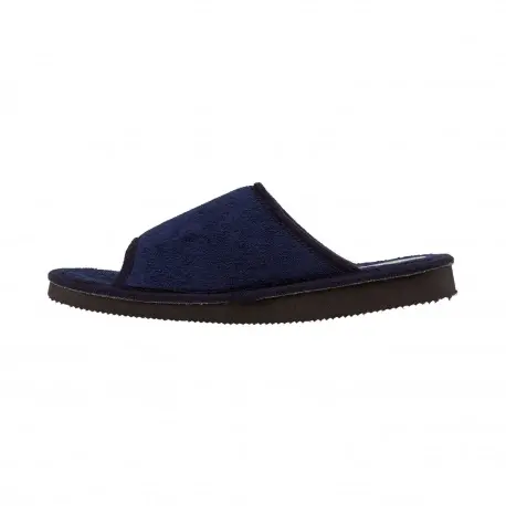 Zapatillas de estar por casa, abiertas en la punta y el talón, fabricadas en tejido toalla, muy fresquitas y ligeras gracias a su suela de EVA. Forro interior y plantilla de tela transpirable y es fácil de limpiar. Disponible en color azul marino. Hecho en España.