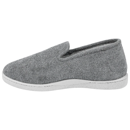 Zapatillas de estar por casa cerradas, fabricadas en tela tipo toalla, color gris oscuro. Cuenta con plantillas efecto gel, que mantienen su forma por más tiempo, dando a tu pie comodidad y confort duradero.