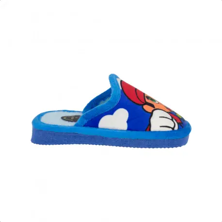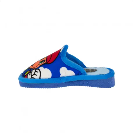 Zapatillas descalzas, de estar por casa, para niños. Fabricadas en telas cálidas y con divertido estampado sobre fondo azul. Suela ligera, con bajo nivel de ruido en la pisada. Calza normal.
