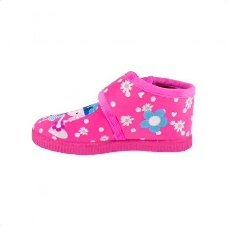 Zapatilla abotinada de estar por casa para niñas, fabricada en tela de precioso estampado de muñeca. Cierre de pegar. Forro interior de tela cálida y suave, perfectas para el Invierno. Suela plana de goma. Calza normal.