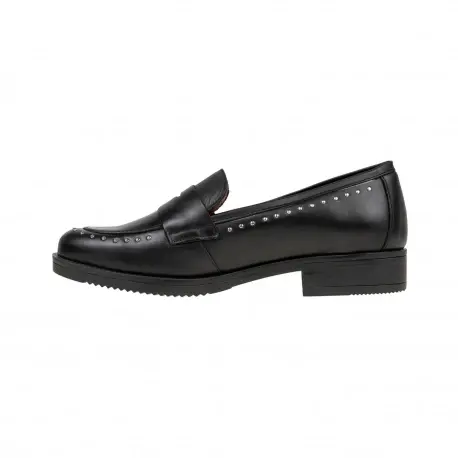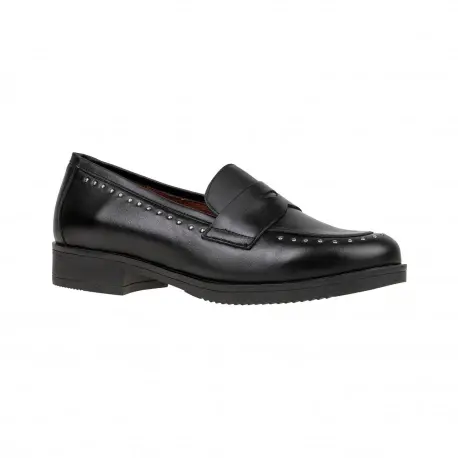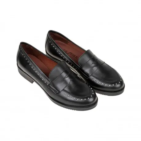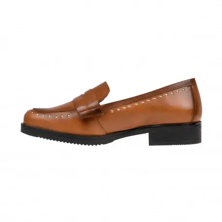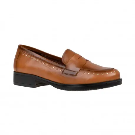 Mocasín hecho en piel color marron con tachas decorativas, muy cómodo gracias a su plantilla de descanso metatarso y su suela que absorbe el impacto. Comodidad y estilo de la mano. Anchura normal. Tacon cuadrado confortable.