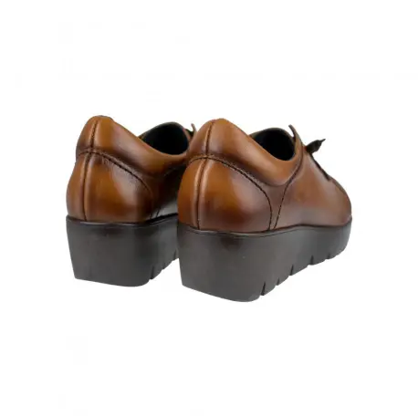 Zapatos casuales con cuña y plataforma. Fabricados en piel natural de buena calidad y acabado artesanal. Forro interior de microfibra efecto piel y plantilla extraíble, muy cómoda y ligeramente acolchada. Suela de goma con plataforma de 2 centímetros y cuña de 4,5 centímetros en total.