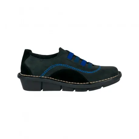 Cuentan con un cierre de gomas elásticas en tonos azules, lo que no solo les da un toque de color y estilo, sino que también hace que sean muy fáciles de poner y quitar. El color negro de estos zapatos los hace muy versátiles y fáciles de combinar con cualquier estilo de ropa. Además, están fabricados en piel nobuk, un material suave y elegante.