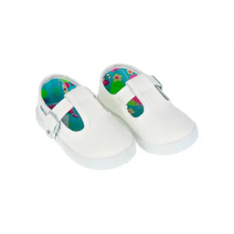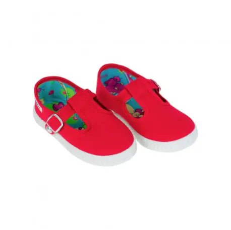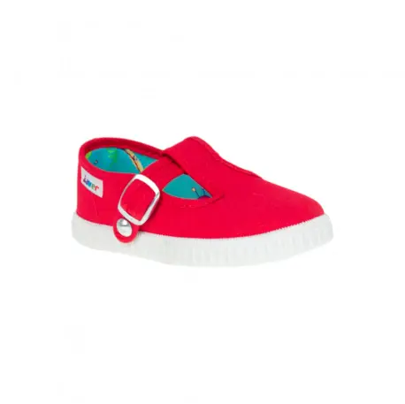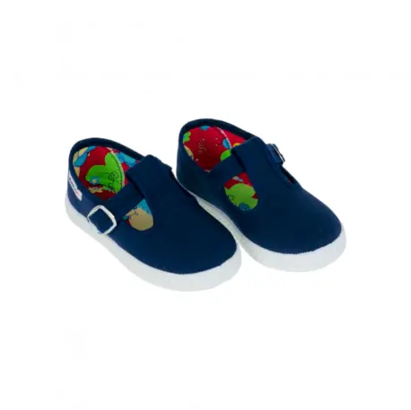 Zapatilla de lona estilo mercedita para niños, diseño en color liso azul marino, rojo y blanco. Cierre de botón de clip, la hebilla es decorativa.