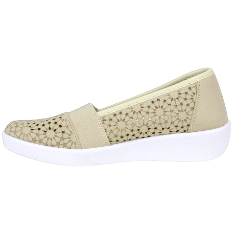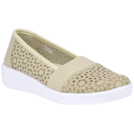 Zapatos de Verano estilo manoletina, fabricados en telas color beis, con troquelado láser, lo que le da sus diseños florales tan característicos.