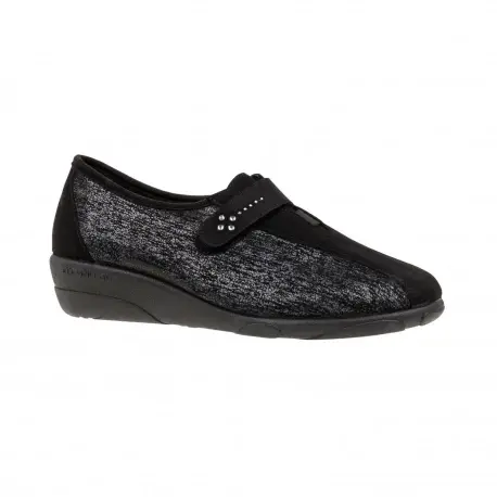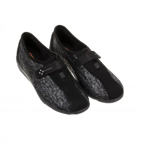 Zapato de licra adaptable y plantilla extraíble de foam muy cómoda. Modelo de horma cómoda y cierre con velcro.