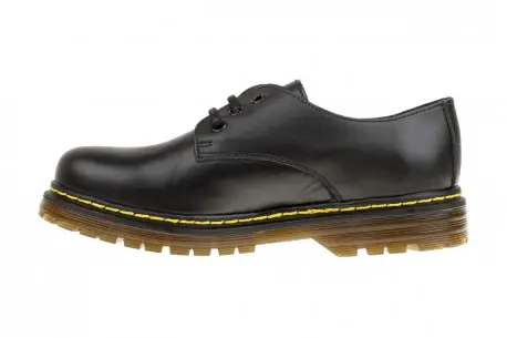Zapato estilo Martin, Oxford en piel, cierre con cordones y cocidos visibles en amarillo para darle contraste. Suela de goma. Colores lisos en negro y verde oscuro, estampado Graffiti. Marca Brans fabricado en España.