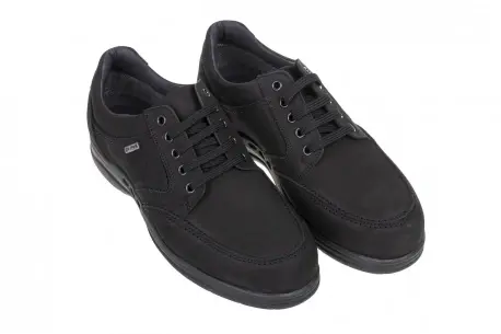 Zapato fabricado en piel nobuck color negro liso, cuenta con membrana impermeable TE-POR que aisla del agua asegurando una correcta transpiración y confort interno.