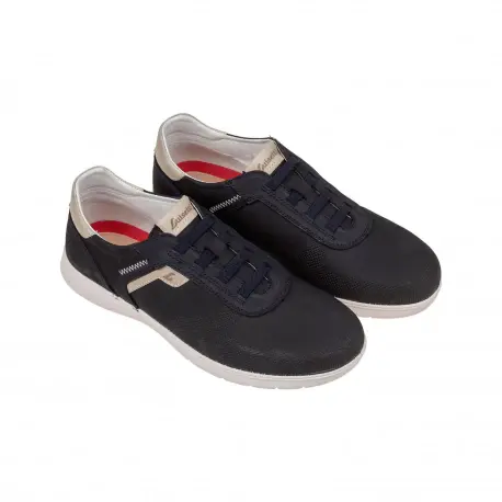 Zapato casual fabricado en piel nobuck combinado, diseño liso en color amarillo y azul marino.