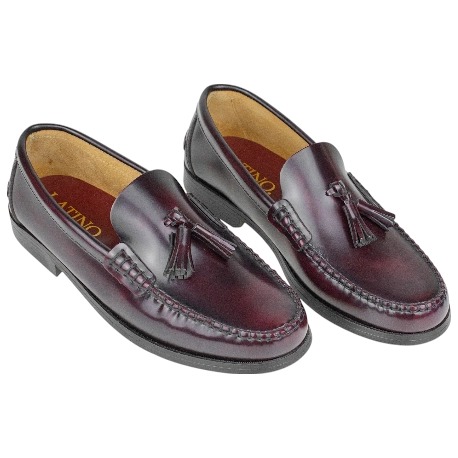 Color negro y granate de acabado florenti, con suela de cuero cosida.
