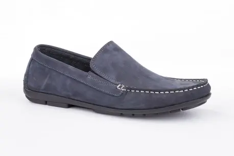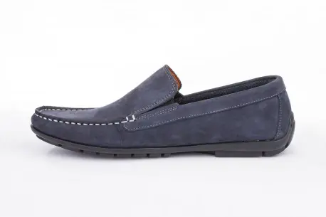 Zapato de hombre estilo mocasín de nobuck (piel) muy blando y cómodo. Detalle de costura a la vista y color azul marino liso. Fabricados en Portugal.