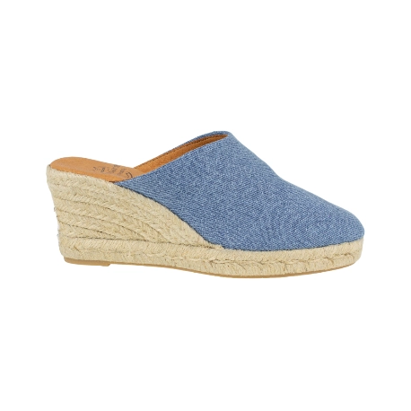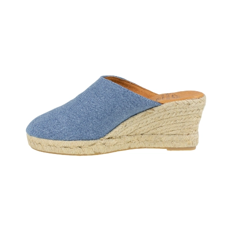 Zuecos fabricados con lona azul de muy buena calidad, y cuña de esparto de 6.5 centímetros. La plantilla de piel tiene tacto suave y lujoso. Suela de goma que aporta una pisada firme.