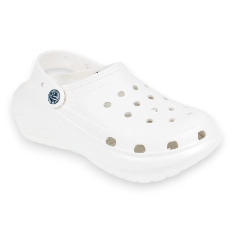 Cómodos y ligeros zuecos de plataforma de 4.5 centímetros. Están hechos completamente de goma en color blanco y cuentan con una tira por detrás para mayor seguridad al caminar.