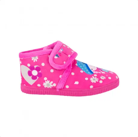 Zapatilla abotinada de estar por casa para niñas, fabricada en tela de precioso estampado de muñeca. Cierre de pegar. Forro interior de tela cálida y suave, perfectas para el Invierno. Suela plana de goma. Calza normal.