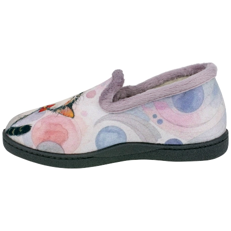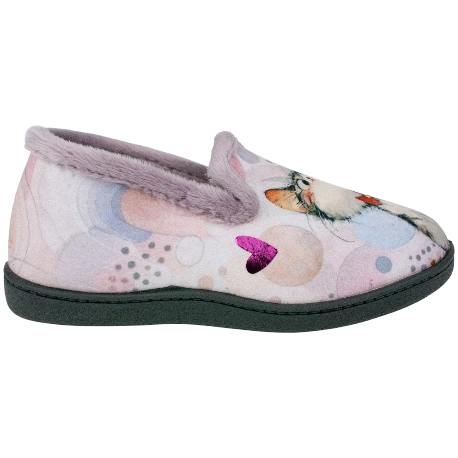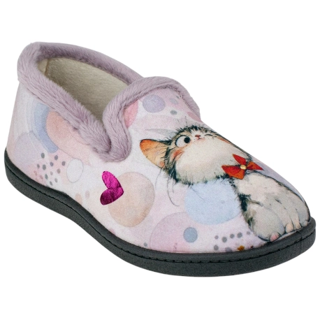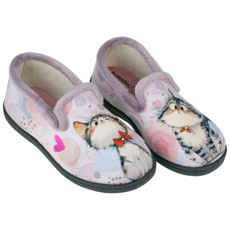 Zapatilla confortable para estar por casa, con diseño de Gatitos sobre fondo rosa. Modelo con forro interior cálido, y plantillas de espuma de PU, alta recuperación, mantienen su forma y amortiguan el paso.