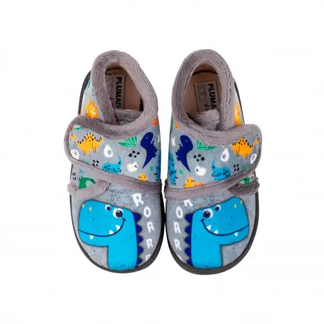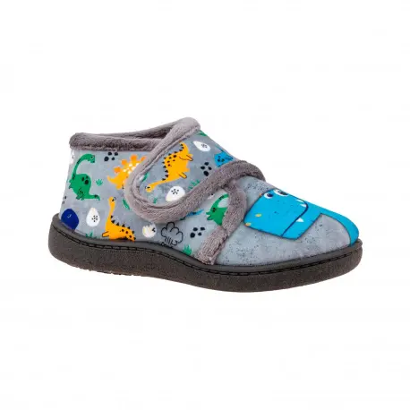 Botita de niño de cierre con velcro. Diseño con estampado de dinosaurios sobre fondo color gris. Forro interior muy suave, que mantendrá sus pies calentitos en los climas fríos.