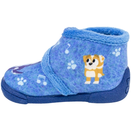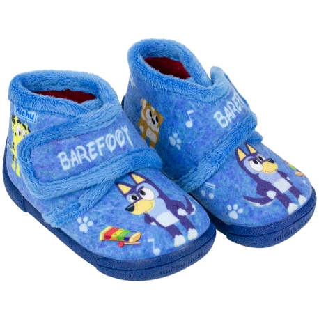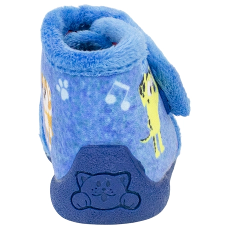 Zapatillas de estar por casa de bota para niños, con cierre de velcro. Estampado de dibujos animados en color azul.