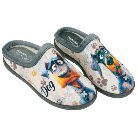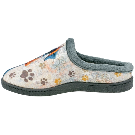 Diseño estampado de Perro sobre tela suave y acogedora. Cuenta con plantilla extraíble, de espuma de PU de alta recuperación, que amortigua la pisada y mantiene su forma acolchada durante más tiempo.