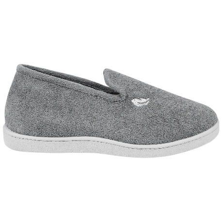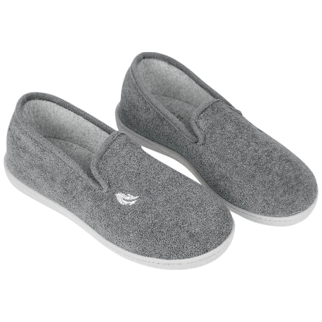 Zapatillas de estar por casa cerradas, fabricadas en tela tipo toalla, color gris oscuro. Cuenta con plantillas efecto gel, que mantienen su forma por más tiempo, dando a tu pie comodidad y confort duradero.
