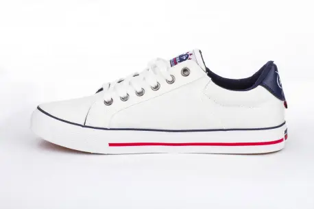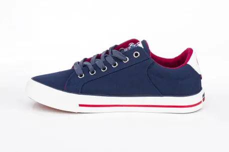 Zapatillas casuales fabricadas en lona de corte bajo para hombre. Tacón plano de 2.5 centímetros de goma con línea roja. Colores mezclados en blanco, azul marino y granate con diseño de triángulo con el logo de la marca en el lateral y el talón con pequeña bandera inglesa.