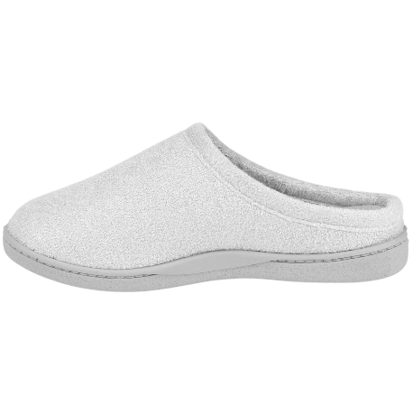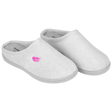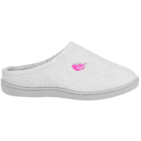 Cómodas zapatillas de descanso, fabricadas en tejido orgánico tipo toalla de color gris, con logo de la marca en fucsia. Incluye plantillas extraíbles de espuma de PU de alta recuperación, que se adaptan al pie y aportan un acolchado firme y duradero.