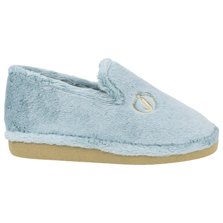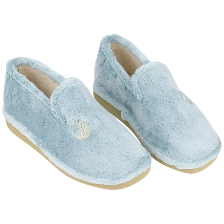 Zapatillas de estar por casa cerradas para mujer, de color azul con logo lateral. Forro interior de pelo, y plantilla anatómica.