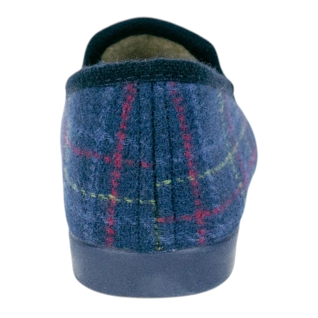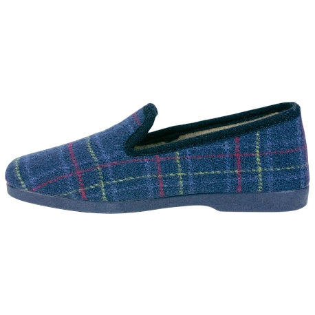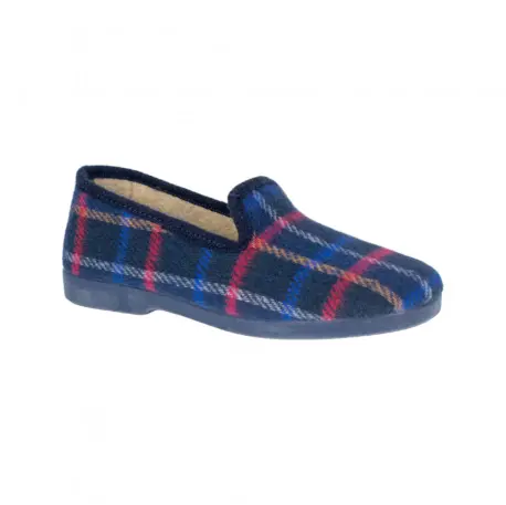 Zapatillas de estar por casa de estilo clásico a cuadros, fabricadas con tela cálida para el invierno y suela de caucho para mayor comodidad. Horma normal y orgullosamente hechas en España.