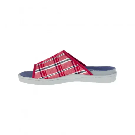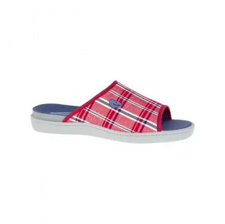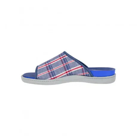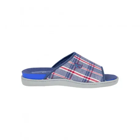 Zapatillas de estar por casa estilo chancla, fabricadas con telas de buena calidad, transpirables y frescas. Diseño a cuadros sobre fondo azul.