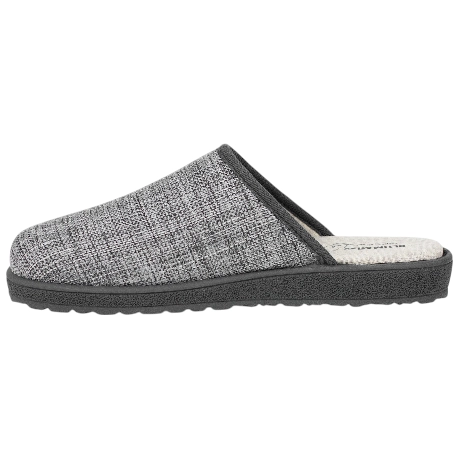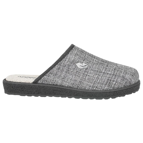 Zapatillas de estar por casa para hombre, abiertas en el talón y con punta cerrada. Fabricadas en tejido jordan color gris. Este modelo de zapatillas Plumaflex tiene su plantilla de gel fija, dando una sensación más firme sin perder su característica suavidad.