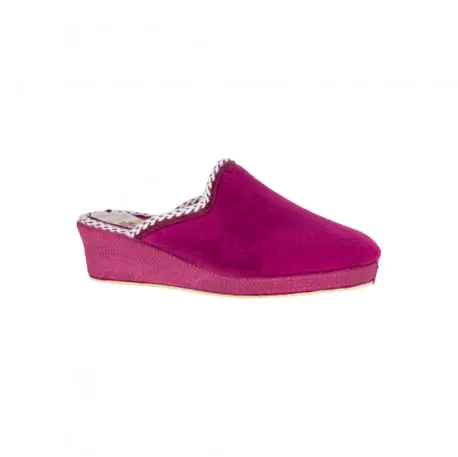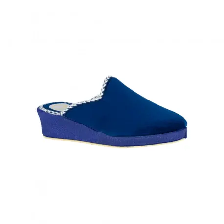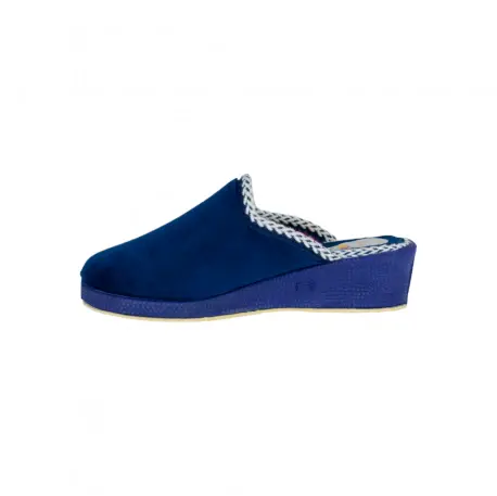 Zapatilla descalza de estar por casa, con tacón cuña de 4,5 centímetros. Fabricada con telas cálidas color azul con vivo blanco.