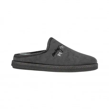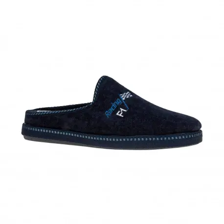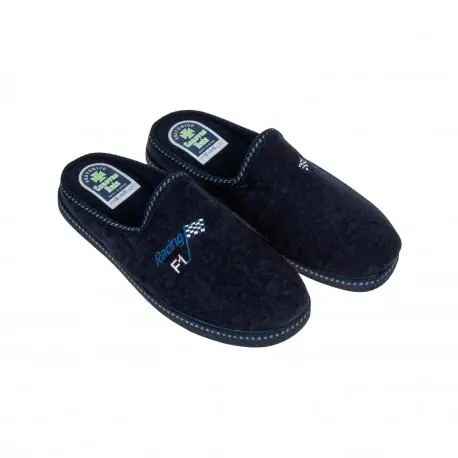 Zapatillas de estar por casa abiertas en el talón en color azul marino y gris oscuro. Plantilla anatómica con cuña interior de 2cm de altura. Muy Cómodas. Detalle: Logo Formula1 en el lateral. Temporada Otoño-Invierno. Fabricada en España