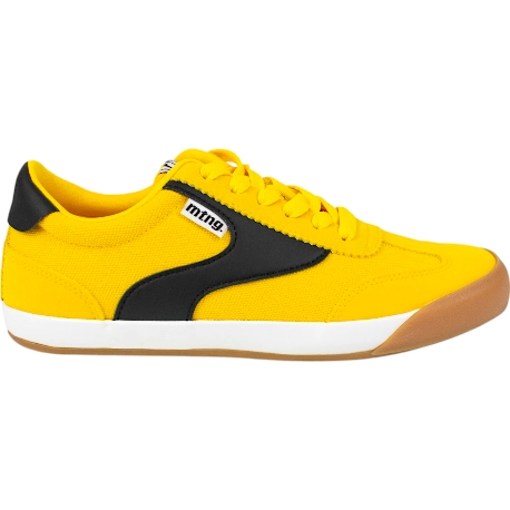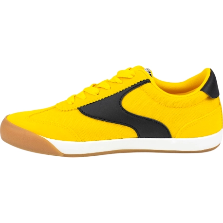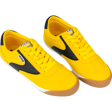 Fabricadas en tela de color amarillo vibrante con detalles en negro en los laterales y ene l talón. Tienen suela de goma plana y cierre de cordones planos.