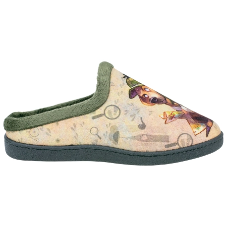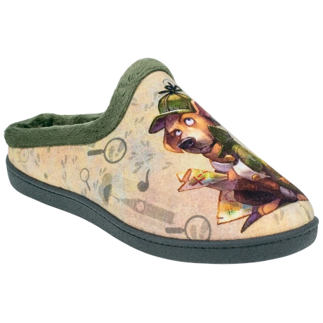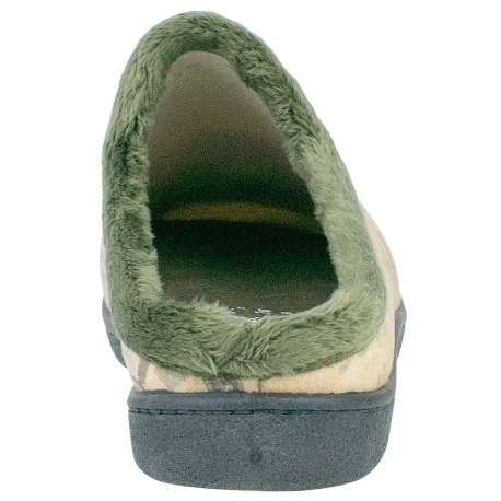 Zapatillas de estar por casa para hombre, semi descalzas, fabricadas en telas cálidas con estampado divertido, ribete verde. Plantillas extraíbles de espuma de PU de alta recuperación, efecto memoria, extra amortiguación en el talón.
