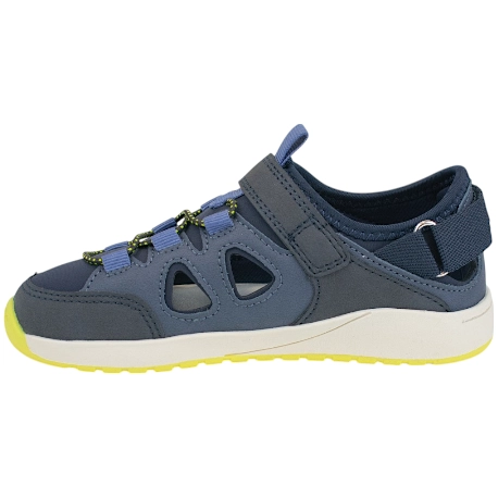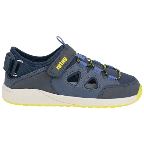 Sandalias respetuosas para niños tipo cangrejera, color azul marino con detalles amarillos y cierre de velcro. Su diseño barefoot se desarrolló en colaboración con el Dr. Juanjo López, traumatólogo deportivo e infantil, para que respete el desarrollo natural de sus pies.